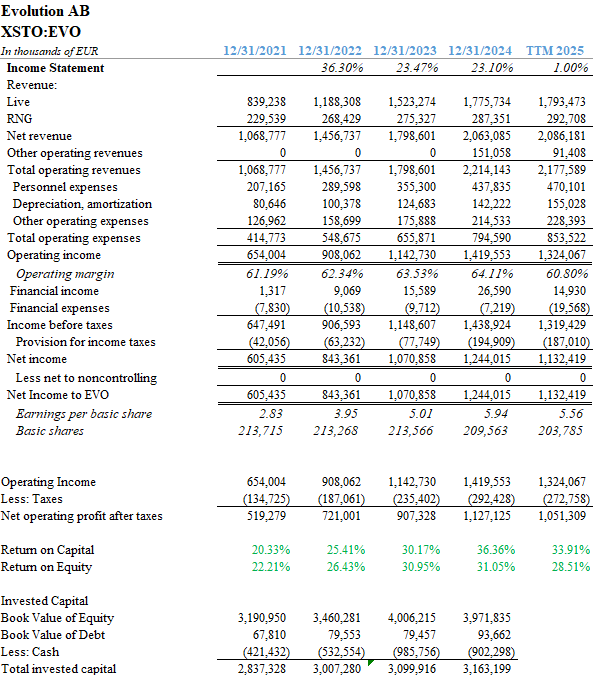 Evolution has created a lot of valuable intellectual property, its games are entrenched in the gambling site ecosystem, and the investment in live studios provides punters with the authentic feel of a casino. The lack of debt, high dividend yield and substantial margins seem to present downside protection. I believe the returns on equity are significant enough that the firm can reinvest its ample cashflow into growth that will exceed 5% over the next decade, so I consider the shares of Evolution to be priced 10-25% below the intrinsic value of the business. Fortis fortuna adiuvat.