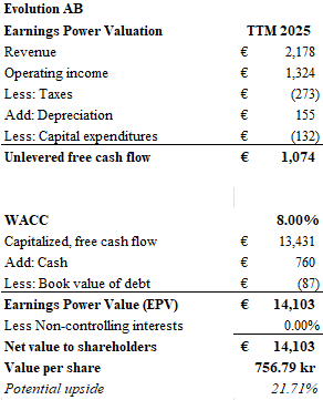 My preferred valuation model is the basic Earnings Power Value (EPV) method advocated by Bruce Greenwald and his peers at Columbia. In the tradition of Ben Graham, normalized unlevered free cash flow is simply capitalized by the weighted average cost of capital (WACC) to arrive at a value for the firm. Subsequently, net debt is subtracted to arrive at a value of the equity. In the case of Evolution, unlevered free cash flow over the trailing twelve-month period was just slightly less than €1.1 billion. Using a WACC of 8% to capitalize this amount results in a value of €14.1 billion once one accounts for the net cash position on the balance sheet. On this basis, Evolution trades at a 22% discount to its market price.