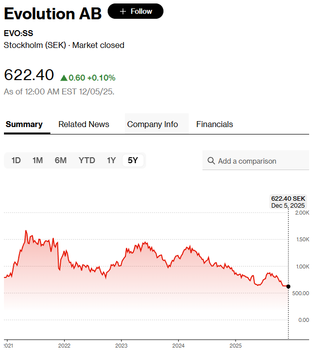 Revenues at Evolution grew at a compound rate of over 25% annually between 2021 and 2024. Unfortunately, the combination of high growth and diverse worldwide internet hosting services attracted the sort of nefarious folks who’ve always lurked in the gambling shadows. Hackers in Asia inflicted widespread outages and security breaches upon Evolution last year. Revenue has plateaued over the past 12 months. The stock price reflects the lost momentum.