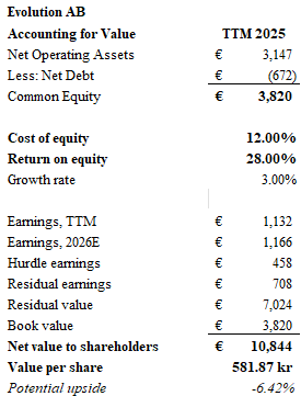 If one assumes a cost of equity of 12% for Evolution, and a return on equity of 28% consistent with recent performance, the future “surplus” earnings calculate to €708 million assuming a growth rate of 3%. This results in a value 581 krona per share, once again, roughly in line with the current price.